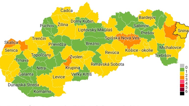 V druhom stupni ostražitosti (oranžová farba) sú okresy Banská Štiavnica, Gelnica, Humenné, Myjava, Skalica a Spišská Nová Ves.