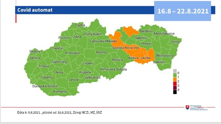 Od pondelka (16. 8.) bude podľa COVID automatu v stupni ostražitosti deväť okresov. Všetky ostatné okresy sú v stupni monitoringu. Zelená bude aj Bratislava, ale iba vďaka vysokej zaočkovanosti.