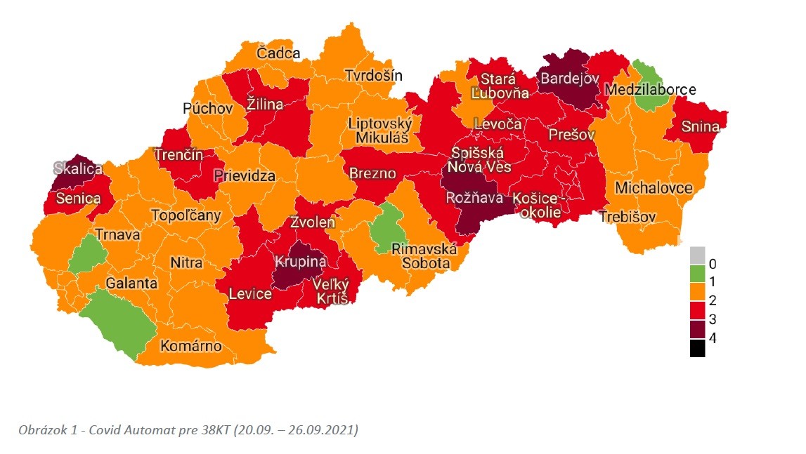 Od piatka (17. 9.) bude okres Bardejov zaradený v druhom stupni ohrozenia, teda v bordovej farbe. Od pondelka (20. 9.) budú podľa COVID automatu v zelenej farbe, teda v stupni monitoringu, už len štyri okresy.