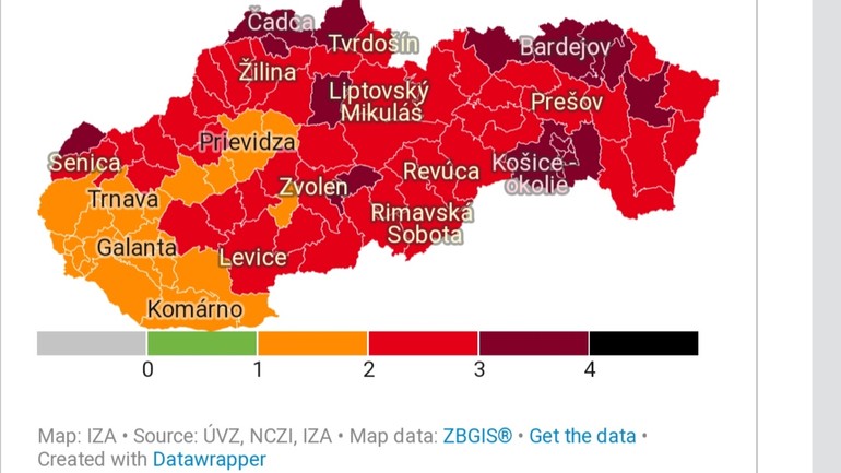 Od pondelka bude 16 okresov v bordovej farbe, Bratislava zostáva oranžová