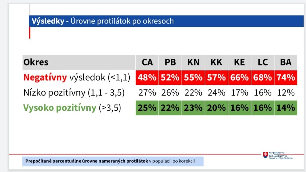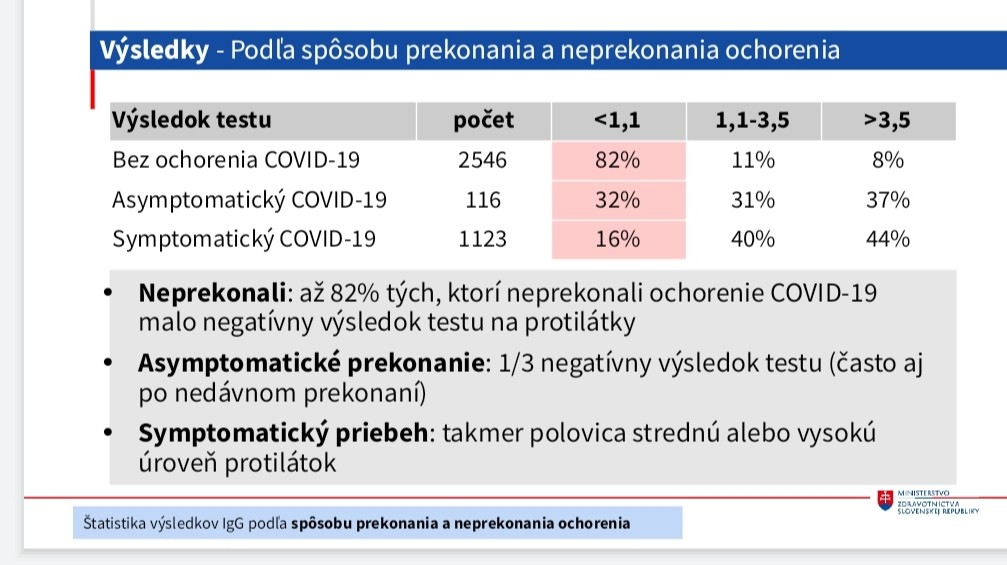 Strednú alebo vysokú hodnotu protilátok mali podľa riaditeľa Inštitútu zdravotných analýz (IZA) Mateja Mišíka najmä ľudia (44 percent), ktorí prekonali ochorenie COVID-19 so symptomatickým priebehom. "Je veľké množstvo ľudí, ktorí nemajú ochranu pred COVID-19 ani v podobe vakcíny, ani v podobe prekonania ochorenia," zhodnotil. Pri bezpríznakových pacientoch tretina nemala žiadne protilátky.