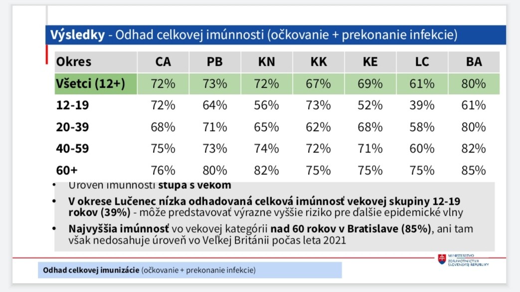 "Úroveň protilátok sa pohybovala okolo 50 percent v čase, keď jednotlivé okresy prechádzali vrcholom svojej delta vlny. To znamená, že tá vlna dosiahla len asi polovičnú časť populácie, ktorá nebola zaočkovaná," vysvetlil matematik Richard Kollár. Upozornil však, že pokles protilátok nastáva pomerne rýchlo a nízke hladiny protilátok pri variante omikron nemusia stačiť.