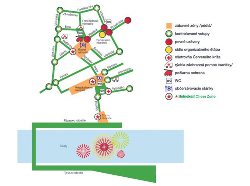 - 00.00 polnočný ohňostroj na Dunaji - Vyvrcholením večera bude tradičná, hudobno-pyrotechnická show na Dunaji. Odpočítavanie posledných minút a sekúnd roka 2008 spojených s privítaním európskej meny sa začne presne o 23.55 h. Hudobný sprievod k ohňostroju obstarajú naživo Cigánski diabli. Ohňostroj bude odpaľovaný z plavidla ukotveného uprostred Dunaja, najlepšie miesto na jeho pozorovanie bude z Rázusovho nábrežia - medzi osobným prístavom a Novým mostom, z Námestia Ľ. Štúra a z petržalského brehu.