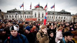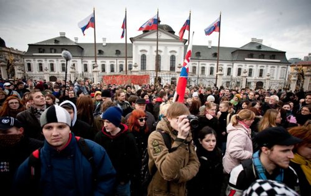 Stovky študentov sa dnes o štvrtej zhromaždili pred Prezidentským palácom, hlavu štátu Ivana Gaparoviča prišli vyzvať, aby nepodpisoval zákon na podporu vlastenectva. Sú nespokojní s tým, že im štát prikazuje spievať hymnu vždy v pondelok pred vyučovaním, a tiež s tým, že im nanucuje štátne symboly v triedach.
