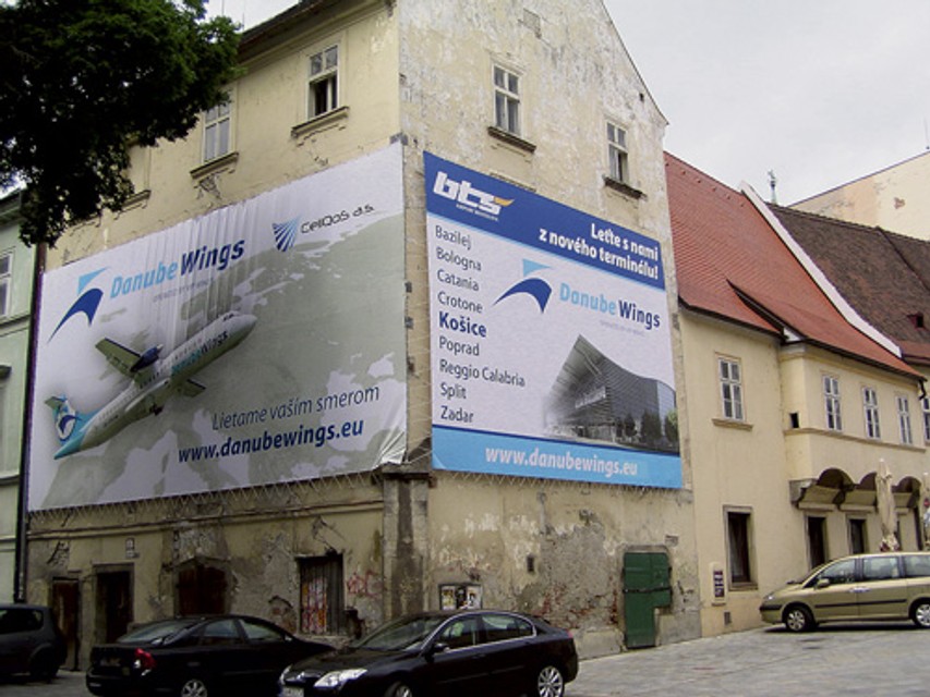 Fasádu historickej budovy na Františkánskom námestí nedávno prekryli dve veľkoplošné reklamy. Podobné reklamy však na budovy v centre mesta určite nepatria a nezvykne ich povoľovať ani pamiatkový stavebný úrad.