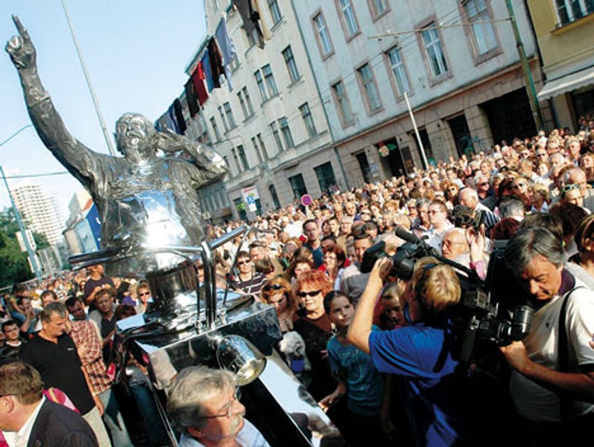 Uplynulú nedeľu sa Julo Satinský na Dunajskú vrátil. Pripomína ho socha akademického sochára Svetozára Ilavského nazvaná Július Satinský načúva zvukom Dunajskej ulice. Nechýbali najbližší príbuzní, priatelia, známi, mnohí poslucháči, diváci, čitatelia. A nebolo to len prísľubom lokší a burčiaku zadarmo, slávnostné odhalenie Satinského sochy si jednoducho mnohí Bratislavčania nenechali ujsť. V podstate ide o jeho bustu, ktorá je osadená na kráčajúcom stole, a prostredníctvom ucha na fasáde domu Satinský načúva, či je na Dunajskej ulici všetko v poriadku. Stôl má riadidlá, aby vedel, kam má ísť, ich súčasťou je aj svetlomet, ktorý mieri na pamätnú tabuľu so Satinského výrokom: Na našej ulici je sloboda.