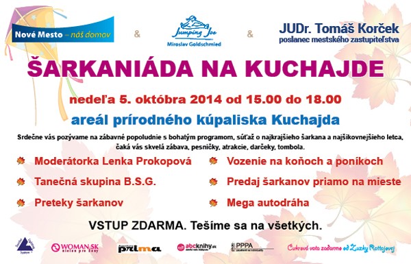 Púšťanie šarkanov je nielen tradičnou zábavou pre veľkých i malých, ale aj pre tých, ktorí sa chcú stretnúť v príjemnom prostredí na čerstvom vzduchu a zabaviť sa s celou rodinou. Tešíme sa na všetkých. Túto milú akciu pre vás pripravili Občianske združenie Jumping Joe, Občianska iniciatíva Nové Mesto - náš domov a mestský poslanec JUDr. Tomáš Korček.