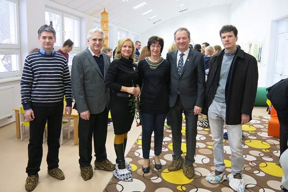 Na fotografii: architekt Slavomir Slabej (prvý žľava), starosta MČ Záhorská Bystrica Jozef Krúpa (druhý zľava), riaditeľka ZŠ s materskou školou Zuzana Kaliariková (tretia sprava)
