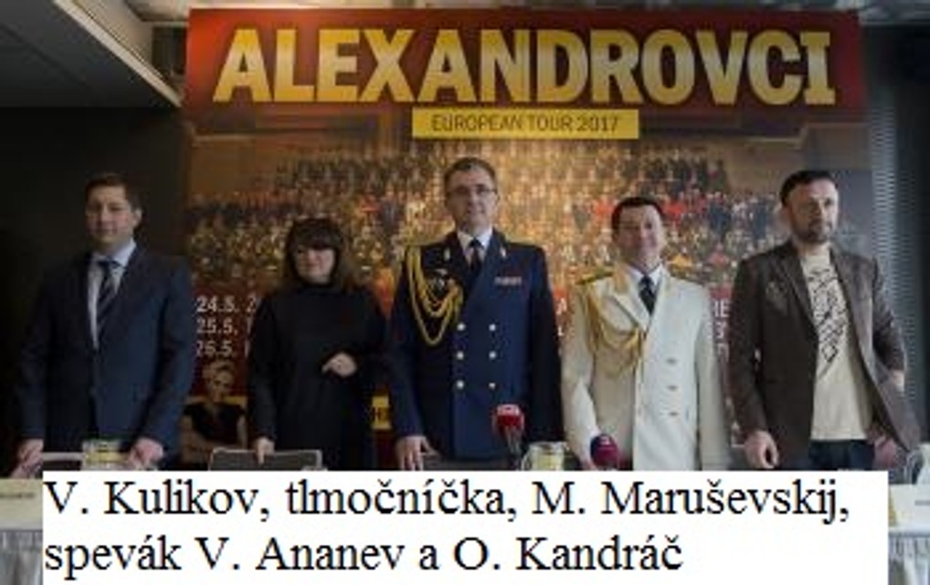 Ruský umelecký spevácky súbor Alexandrovci opäť príde na Slovensko. V rámci svojho európskeho turné 2017 navštívi deväť slovenských miest vrátane Bratislavy. Na koncertoch armádneho súboru vystúpia aj Kandráčovci, ktorí budú robiť predskokanov. Spievať bude aj Helena Vondráčková.