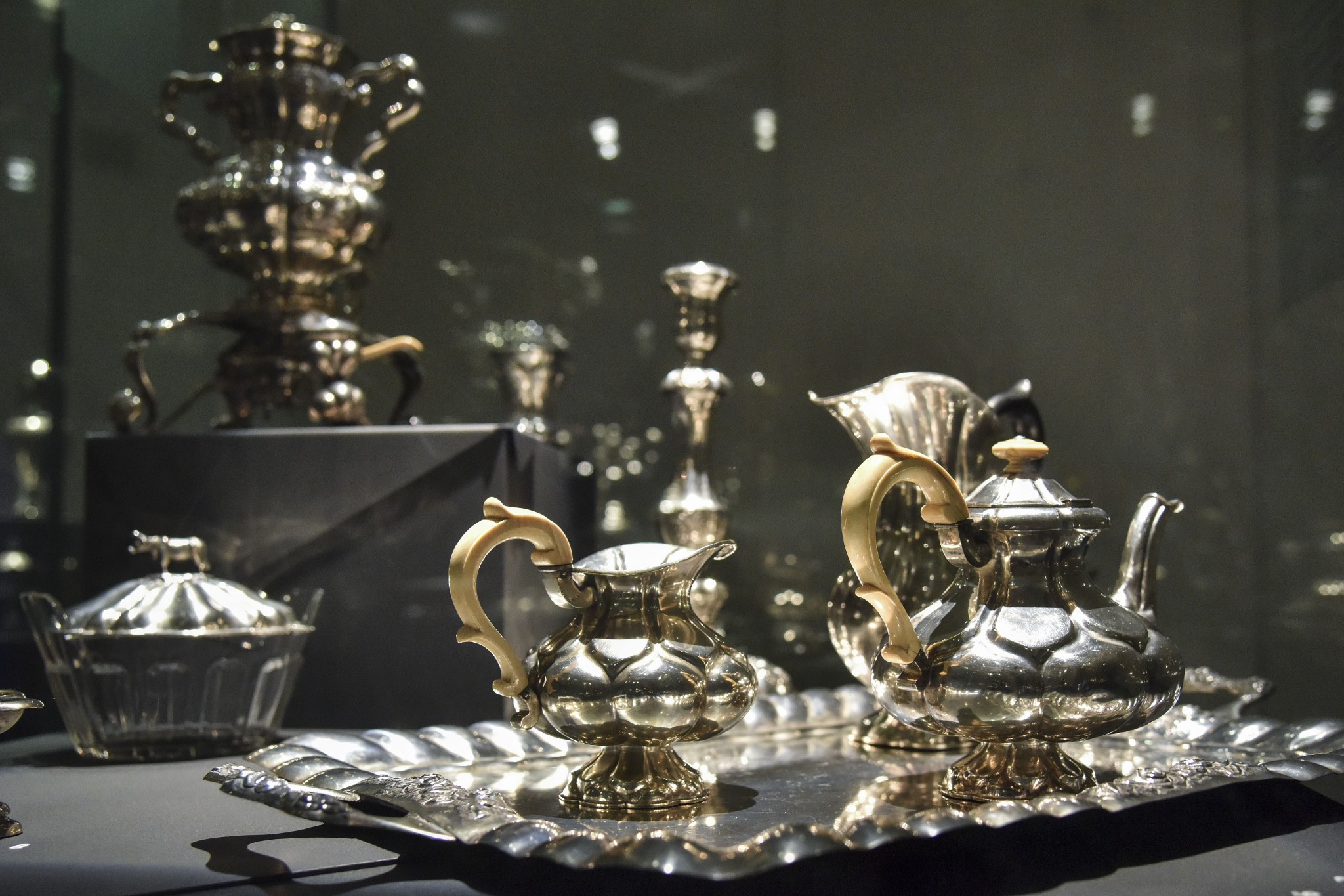 Vo vitrínach sú šperkovnice, svietniky, poháre, soľničky, tanieriky, tácky, nádoby na maslo, kliešte na cukor, lopatka na tortu a iné potreby do šľachtickej domácnosti. Vyrobili ich majstri zo slovenských cechov, z Viedne i Nemecka. Niektoré sú zdobené zlátením alebo rytím ženských postáv či inými motívmi.