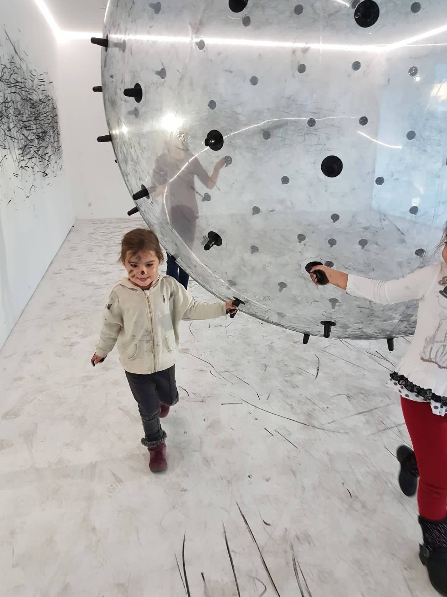 K odbornému výkladu sa ešte dostaneme. Keď vojdete do miestnosti, uvidíte pred sebou obrovskú guľu naplnenú héliom, ktorú môžete vy sami alebo deti posúvať po priestore v tvare L. Guľa či balón je pokrytý hrotmi z dreveného uhlia. A tie hroty nepokreslia len vás, ale aj steny. Je to naozaj fascinujúce predstavenie, keď práve vy či vaše deti môžete byť súčasťou a tvoriť umenie. Pripravte si však vlhčené utierky, aby ste nevychádzali špinaví od uhlia. Mimochodom, tie vám na mieste po zážitku ponúknu aj sami. Výstava trvá do 30.10.2018 a vstup je voľný.