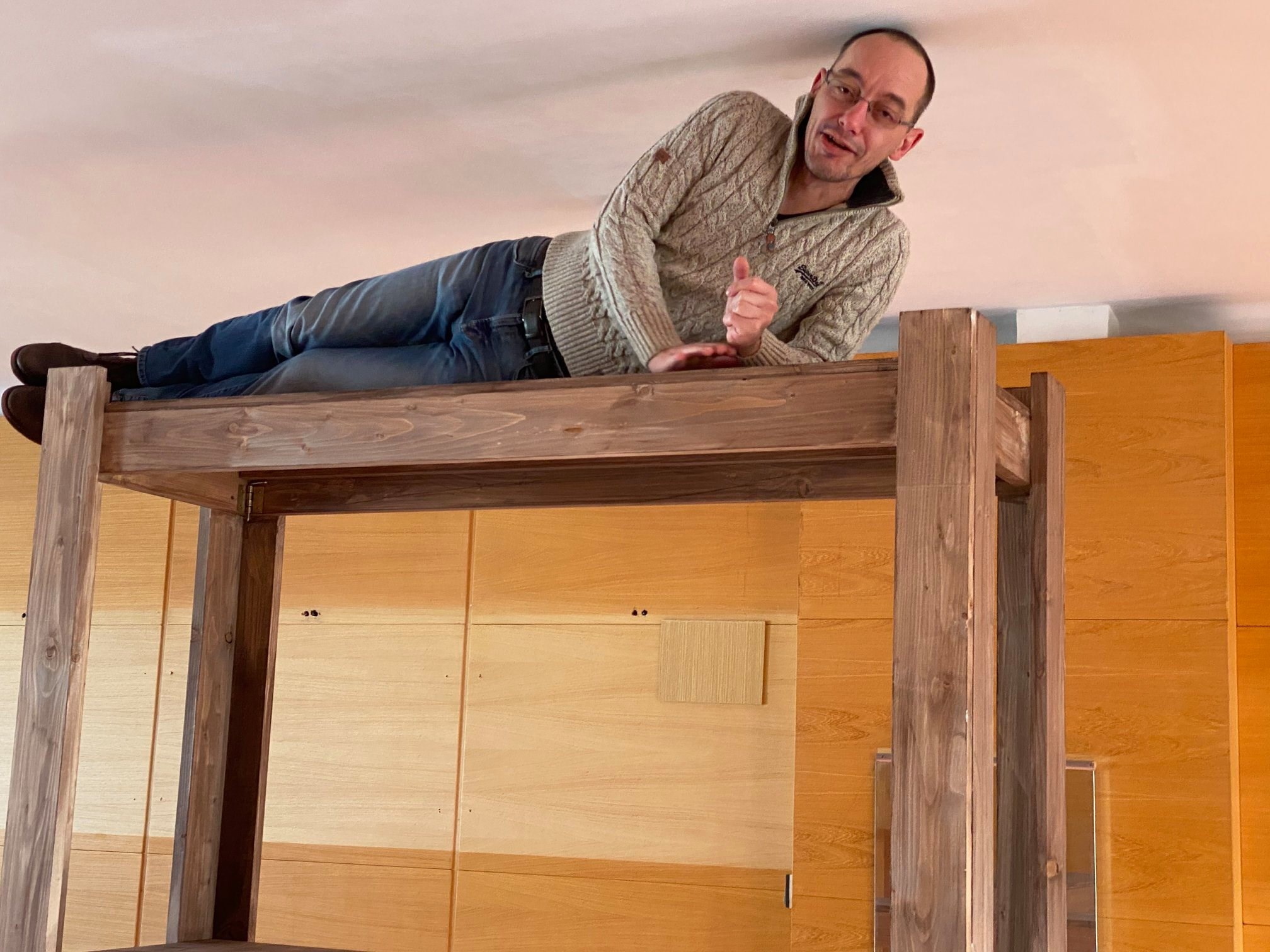 Režisér Michal Vajdička skúša nosnosť jednej z ústredných rekvizít novej hry Mein Kampf - drevenej prične...