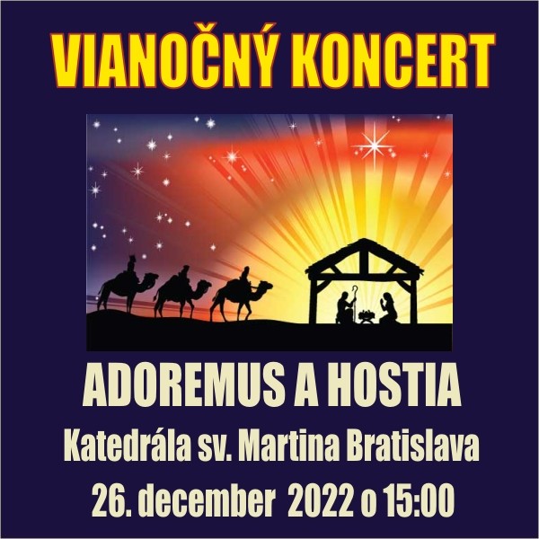Slovenský spevácky zbor ADOREMUS Vás pozýva na svoj tradičný Vianočný koncert v Katedrále sv. Martina v Bratislave 26. decembra 2022 o 15. hodine, aby Vám svojim tradičným koncertom priniesli hudobné stvárnenie tajomstva Vianoc.