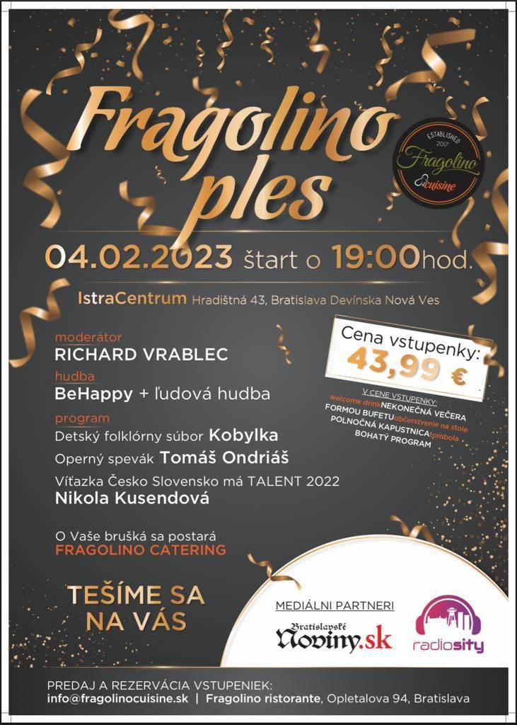 V Istra centre na Hradištnej 43 v Devínskej Novej Vsi sa zabavíte na Fragolino plese, ktorý moderuje Richard Vrablec. Na podujatí, ktoré sa začína o 19.00 hodine, vystúpi aj detský folklórny súbor Kobylka, operný spevák Tomáš Ondriáš či víťazka talentovej šou Nikola Kusendová.