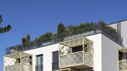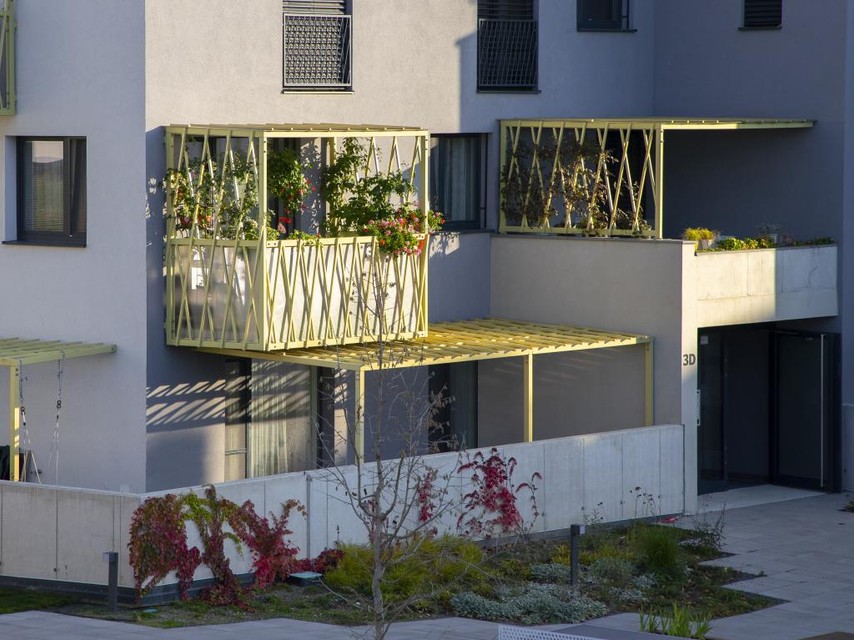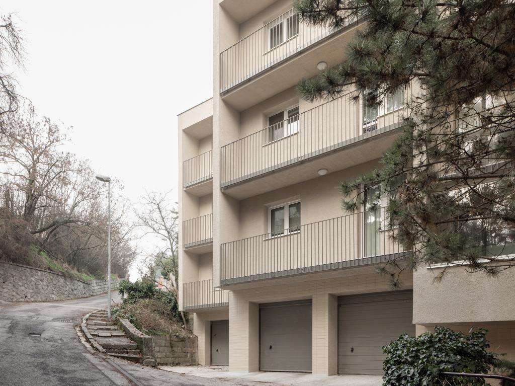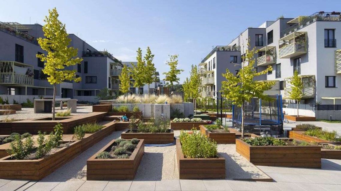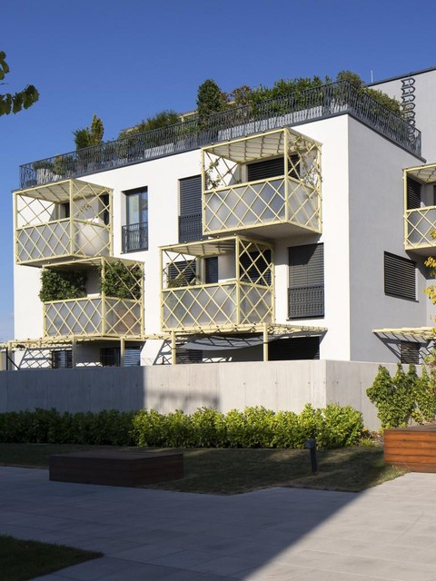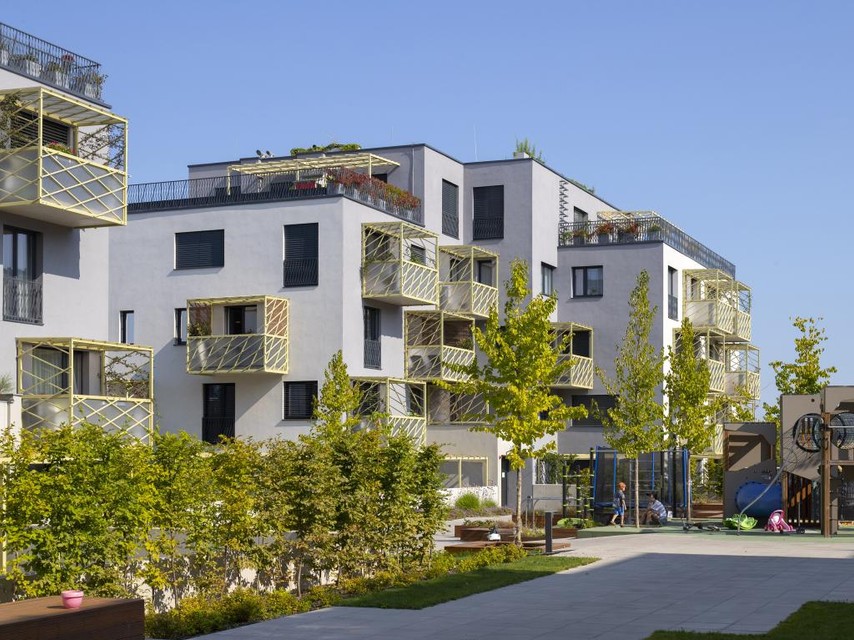Kolísky - bytový komplex štyroch domov, ktoré sa svojimi vnútornými nárožiami obracajú do uzavretého komunitného vnútrobloku, ponúkajú mestské bývanie na rozhraní novej obytnej štvrte a tradičnej vidieckej zástavby.