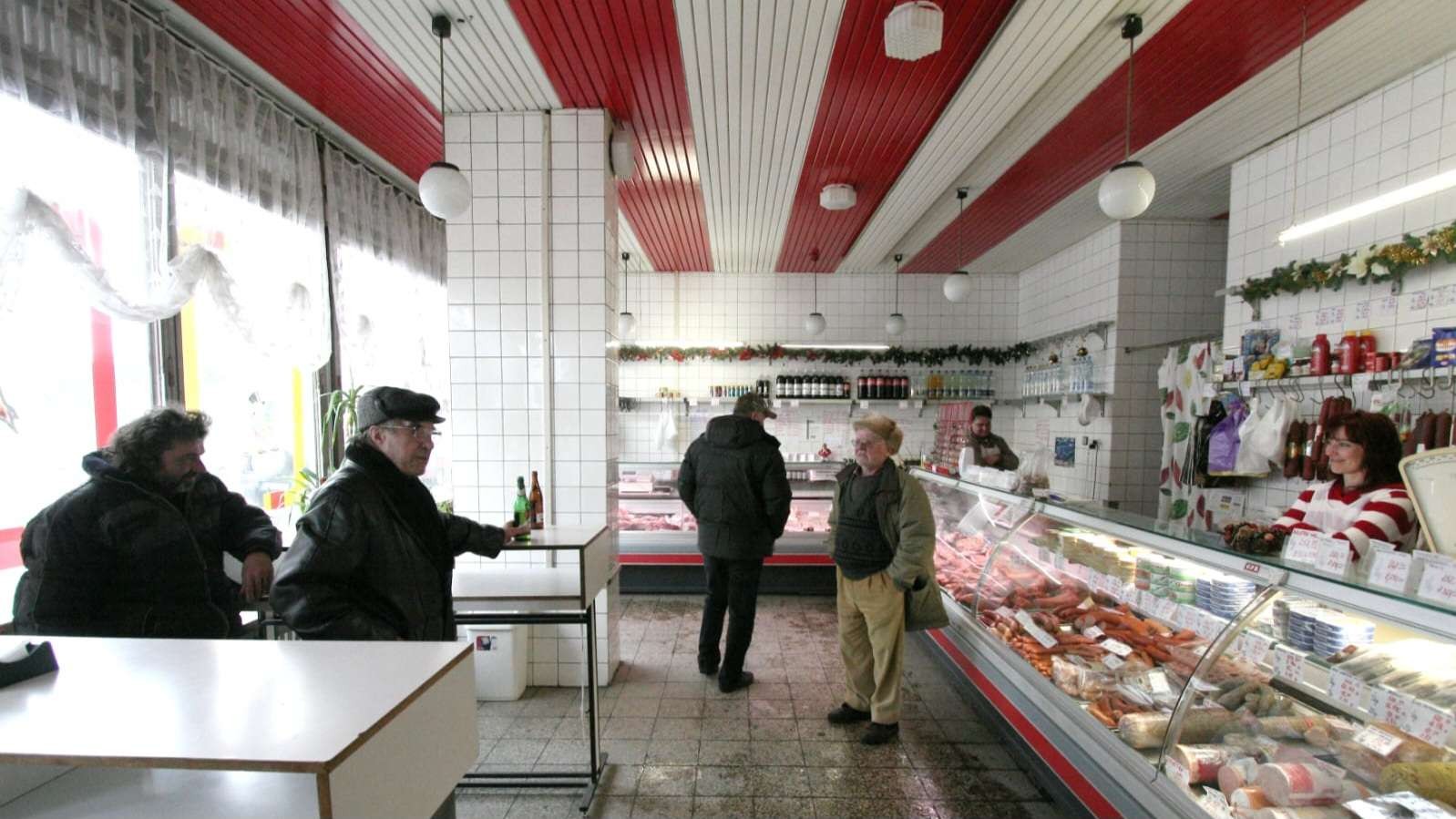 Pôvodné mäsiarstvo kedysi. Ako môžete vidieť pri porovnaní s úvodnou fotografiou, zachovali sa stropy, kachličky, lampy i podlaha.