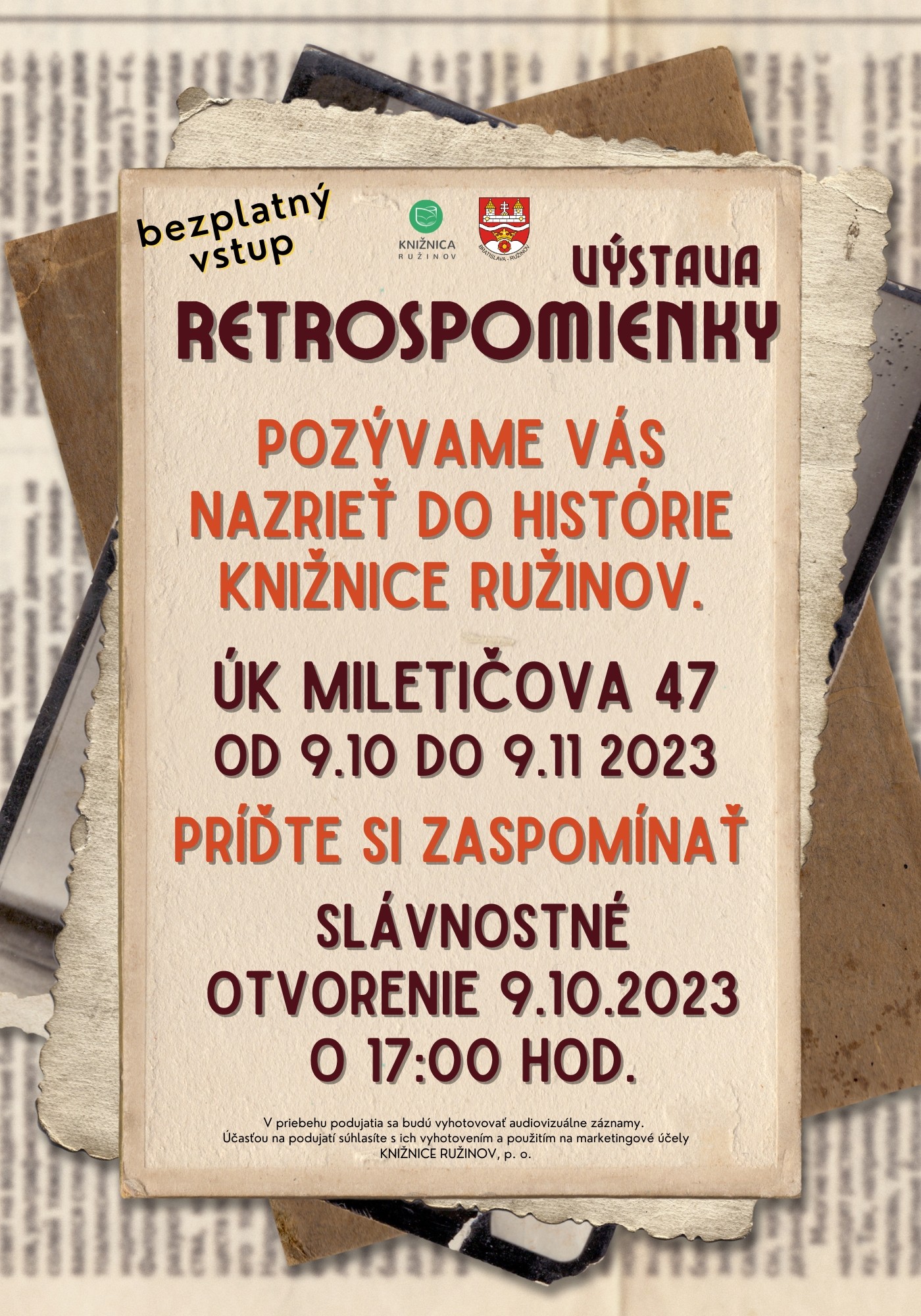 Knižnica Ružinov pripravila v Ústrednej knižnici na Miletičovej 47 milú výstavu spomienok na svoju históriu. Poďte si zaspomínať, nazrite do kroník, a možno sa aj nájdete na starých fotografiách. Viac na www.kniznica-ruzinov.sk
