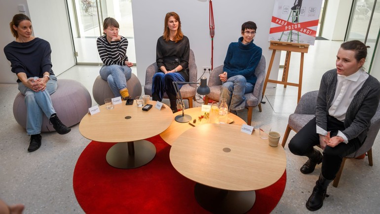 Na snímke zľava producentka Ľubica Orechovská, režisérky Lena Kušnieriková, Jana Durajová, producentka Zuzana Mistríková a protagonistka filmu, generálna riaditeľka SNG Alexandra Kusá