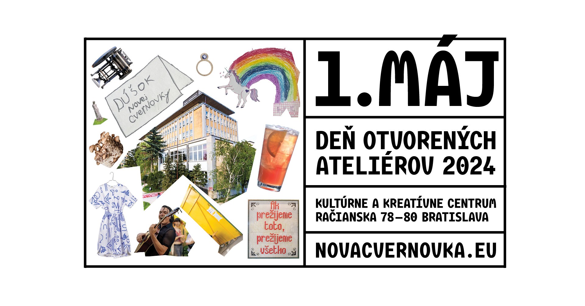 Aj v roku 2024 v Novej Cvernovke spoločne oslávime sviatok práce otvorenými ateliérmi. Navštívte v čase od 10. h do 22. h priestory bývalej chemickej priemyslovky a zažite najväčšie cvernovkárske podujatie, ktoré odhalí, ako pracujú kultúrni robotníci. Viac na novacvernovka.eu