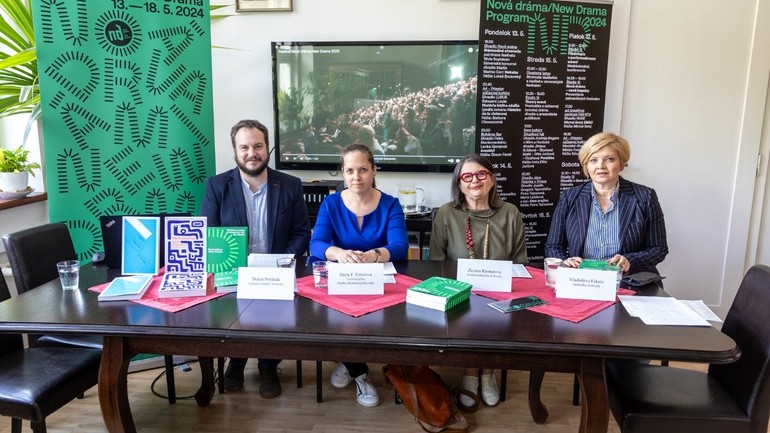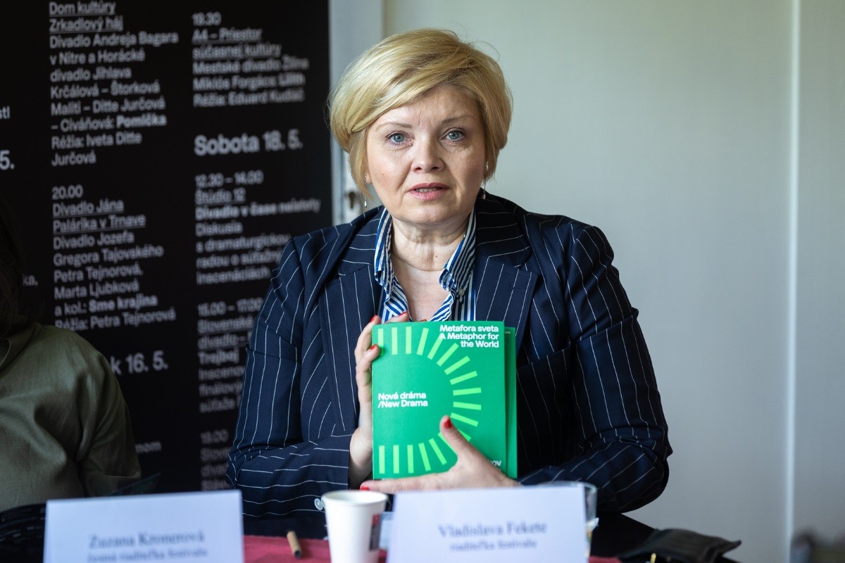 (na foto z tlačovej konferencie zľava výkonný riaditeľ festivalu Dušan Poliščák, teatrologička a členka dramaturgickej rady Dária F. Fehérová, čestná riaditeľka festivalu Zuzana Kronerová, riaditeľka festivalu a zostavovateľka publikácie Nová dráma/New Drama. Metafora sveta. Dvadsať rokov Vladislava Fekete.)