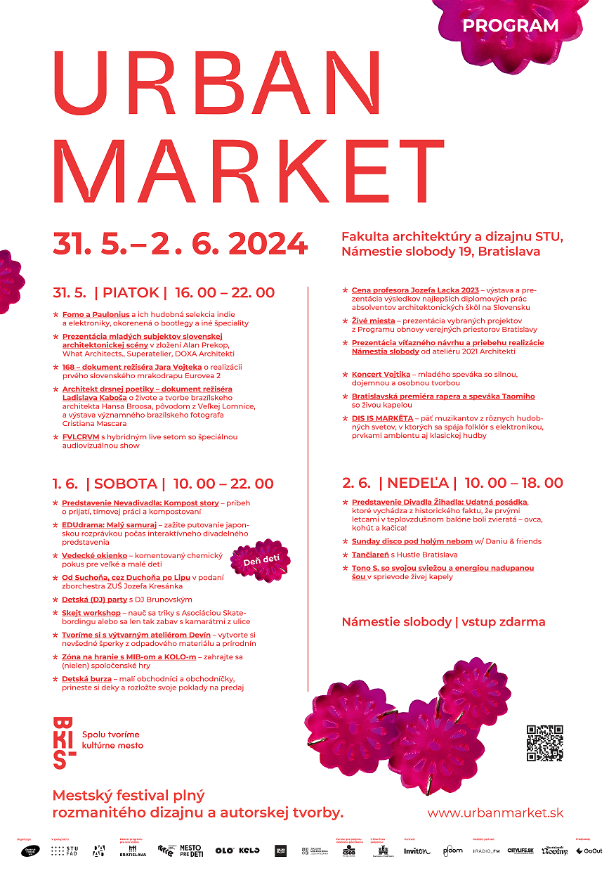Počas sobotného Medzinárodného dňa detí sa Urban Market spája s BKIS a prinášajú pestrý program pre tých najmladších. „Urban Market-u sa každý rok darí skoncentrovať na jedno miesto tvorcov vizuálne atraktívneho dizajnu, v ktorom sa prelína umelecký prejav autorov s ich remeselnou zručnosťou. Máme spoločný zámer - priniesť návštevníkom a návštevníčkam čo najviac kvality a pestrosti, okrem zakúpených vecí si domov odniesť aj zážitky z koncertu a spoločne stráveného času“, hovorí o spolupráci Katarína Hulíková, riaditeľka BKIS. Pre deti sú pripravené divadelné predstavenia, nevaDIvadlo s Kompost story a interaktívne predstavenie Malý samuraj od EDUdrama. Komentovaný chemický pokus si deti vyskúšajú počas Vedeckého okienka, tvoriť budú s Výtvarným ateliérom Devín a triky na skejte sa naučia pod vedením Asociácie Skateboardingu. Uskutoční sa tiež detská burza, detská dj párty s DJ Brunovským a zónu na hranie spolu pripravia MIB, Mesto pre deti, KOLO a OLO. Čerešničkou na torte bude hudobné predstavenie Od Suchoňa cez Duchoňa po Lipu v podaní zborchestra ZUŠ Jozefa Kresánka.
