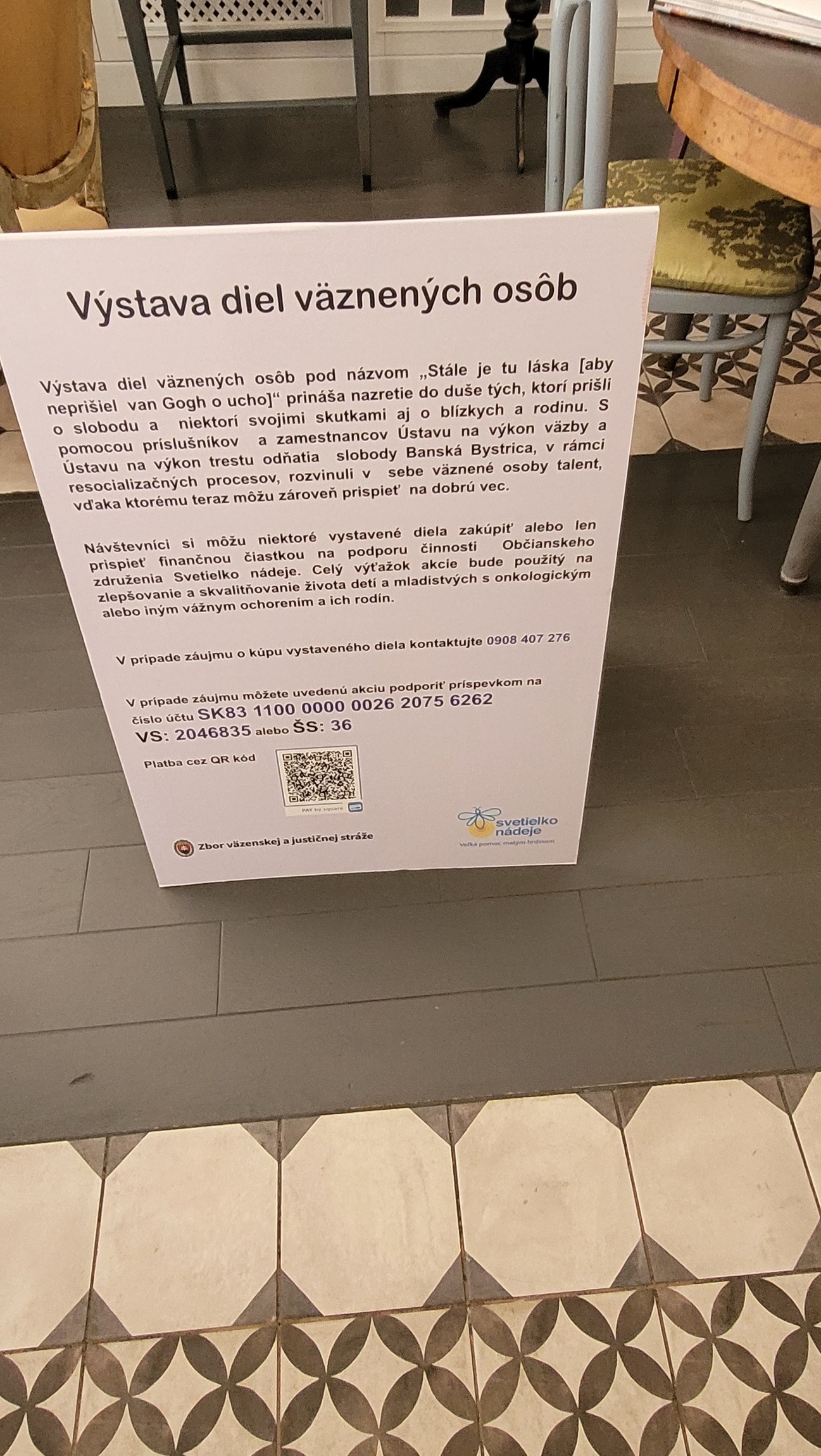 Obrazy sú totiž na predaj a celý zisk smeruje na účet občianskeho združenia Svetielko nádeje, ktoré od svojho vzniku v roku 2002 poskytlo pomoc viac ako 900 deťom s onkologickým ochorením, deťom v hospicovej starostlivosti a ich rodinám. Samozrejme, nie každý si môže dovoliť kúpiť obraz a nie každý chce, ale aj tak by radi finančne prispeli. Preto je na mieste k dispozícii aj QR kód, cez ktorý môžu ľudia prispieť na túto myšlienku akoukoľvek sumou.