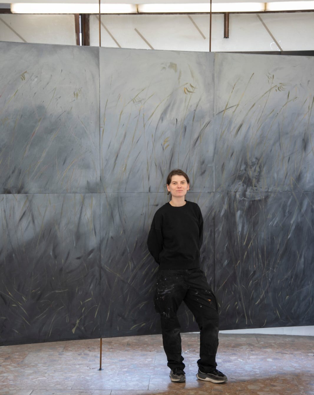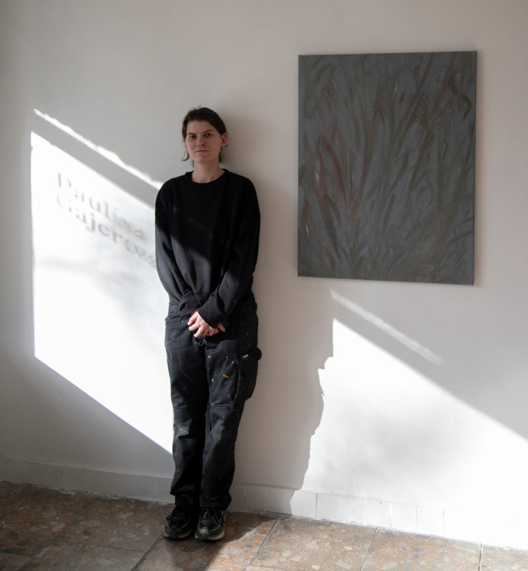 Paulína Gajerová skončila bakalárske štúdium maľby na VŠVU, magisterské štúdium potom absolvovala na Sandberg Instituut in Amsterdam v Holandsku. Domov natrvalo sa vrátila minulý rok na jar. Téme zmeny krajiny sa na plátne venuje posledné dva roky. „Nechcem spadať do romantizujúcich predstáv o krajine, pretože pre mňa krajina znamená to, čo tu žijem. Pre mňa je krajina napríklad aj Agátka, ktorá sem prišla pre piškótku. Sú to veci, ktoré formovali to, ako dnes vnímam Petržalku,“ vysvetľuje. Tak vznikla aj jej absolventská práca, šestica obrazov, ktoré evokujú panely. Vládne im čierna farba a predsa sa na pozadí vynára postava, odrazu vnímate aj listy rákosia. „Je to Chorvátske rameno?“ pýtam sa. „Vychádza to z mojej spomienky s babkou. Keď som šla do Petržalky, vedela som, že idem do divočiny, ktorá bola všade – veľká a nekonečná. Aj obraz sa volá Náznaky polí zostávajú. Paneláky sú totiž podstavené presne na tých lúkach, hájoch a dvoroch.“