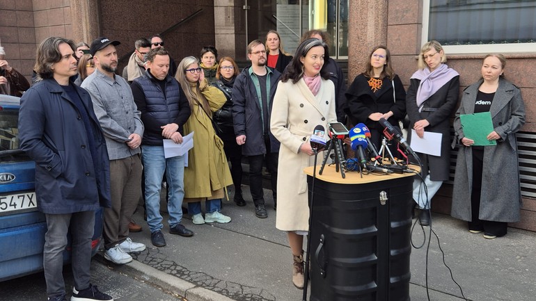 Jana Dekánková na tlačovej konferencii kultúrnych inštitúcií pred budovou FPU