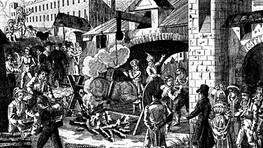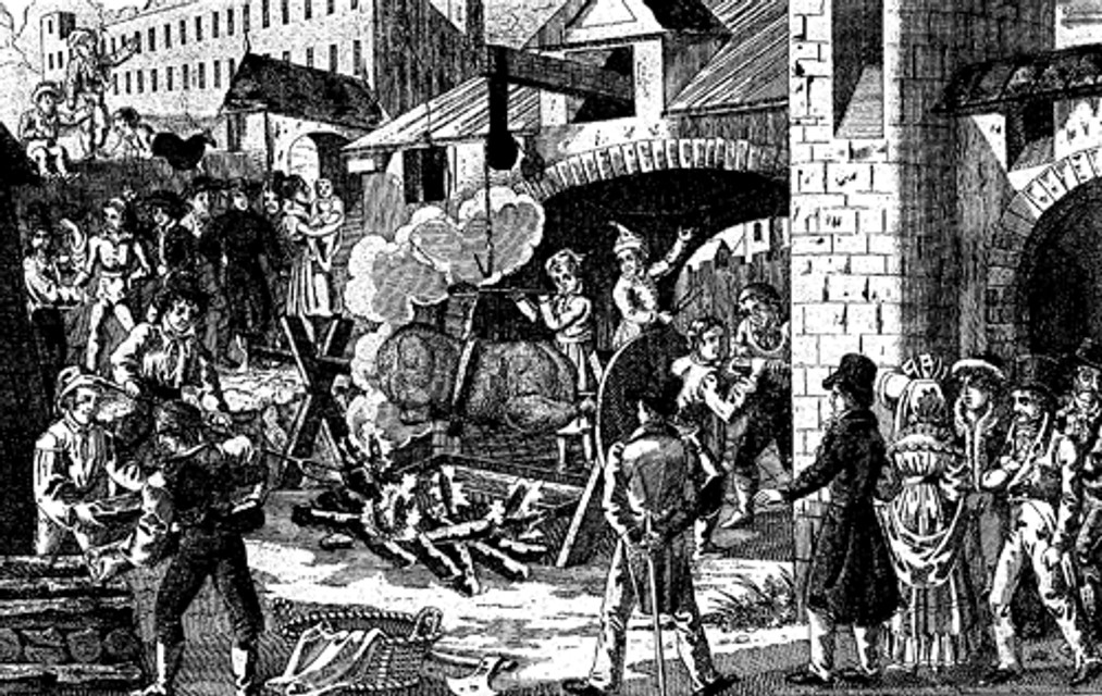 Pečenie vola v mestskej priekope pri príležitosti korunávacie Ferdinanda V. v roku 1830.