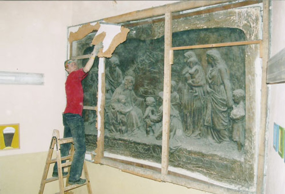Nie je známe, kedy presne bolo zakryté, ale je predpoklad, že sa tak stalo krátko po nástupe komunistov k moci - z ideologických dôvodov. Nádherné dielo zo sadry patinovanej nahnedo, aby navodzovalo dojem, že je z bronzu, je v pomerne zachovalom stave. Reliéf teraz ešte prezrú reštaurátori.
