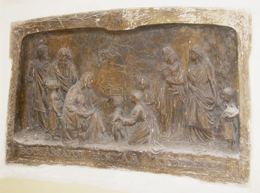 Rozmerný reliéf sa volá Nechajte maličkých ku mne prísť (Ježiš medzi deťmi) a ide o výjav z Nového zákona. „Je to vysokokvalitné dielo,“ povedala nám Ž. Grajciarová. „Doteraz sa za vrchol tvorby Roberta Kühmayera pokladala Kačacia fontána, ale tento reliéf sa jej výtvarnou kvalitou určite vyrovná.“