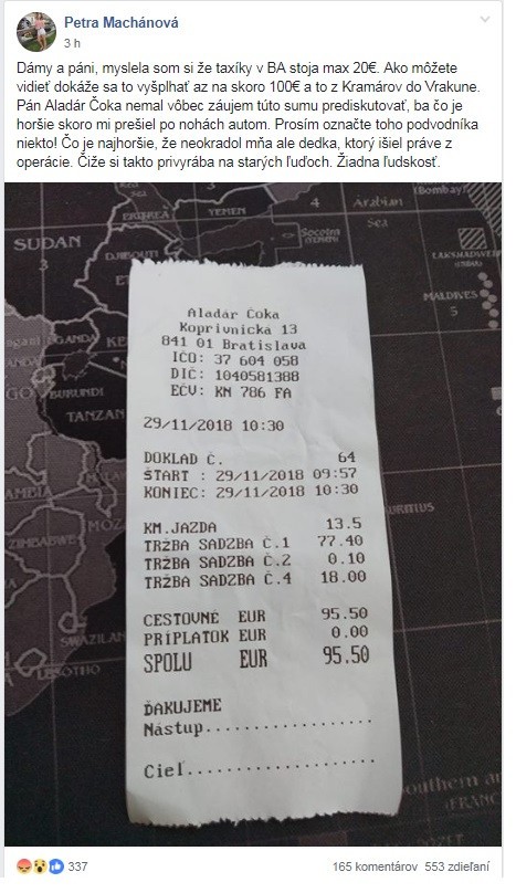 Nepríjemný zážitok na sociálnej sieti publikovala Petra Machánová s nasledujúcim textom: "Dámy a páni, myslela som si že taxíky v BA stoja max 20 €. Ako môžete vidieť dokáže sa to vyšplhať az na skoro 100 € a to z Kramárov do Vrakune. Pán Aladár Čoka nemal vôbec záujem túto sumu prediskutovať, ba čo je horšie, skoro mi prešiel po nohách autom. Prosím, označte toho podvodníka niekto! Čo je najhoršie, že neokradol mňa, ale dedka, ktorý išiel práve z operácie. Čiže si takto privyrába na starých ľuďoch. Žiadna ľudskosť."