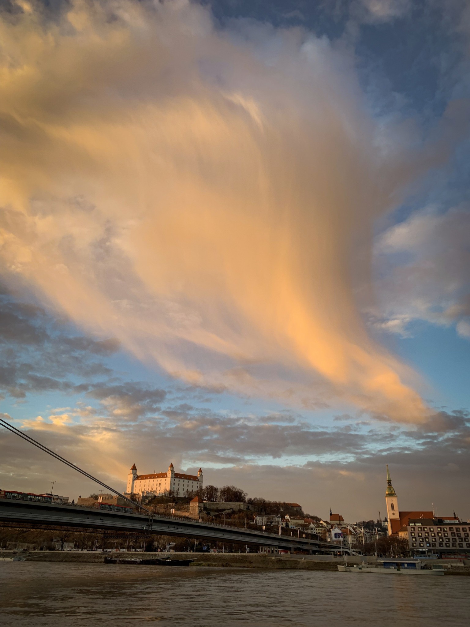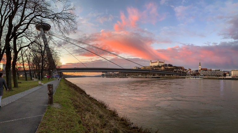Možno ste si aj vy včera všimli nad Bratislavou zaujímavo zafarbenú oblohu približne v čase západu slnka. Jednej z obyvateliek Devínskej Novej Vsi sa podarilo urobiť záber, na ktorom vidno pás pripomínajúci akýsi dúhový záves...