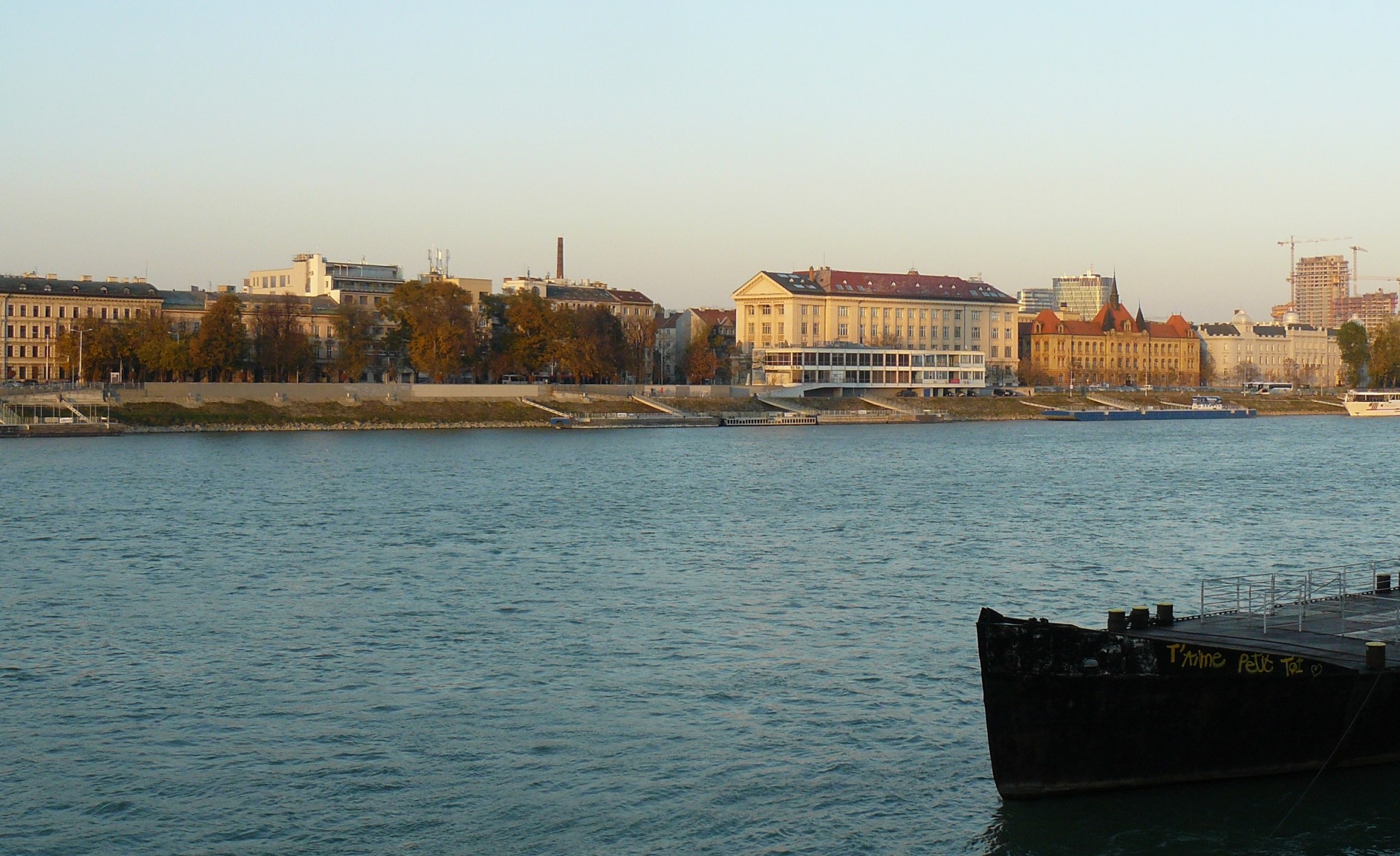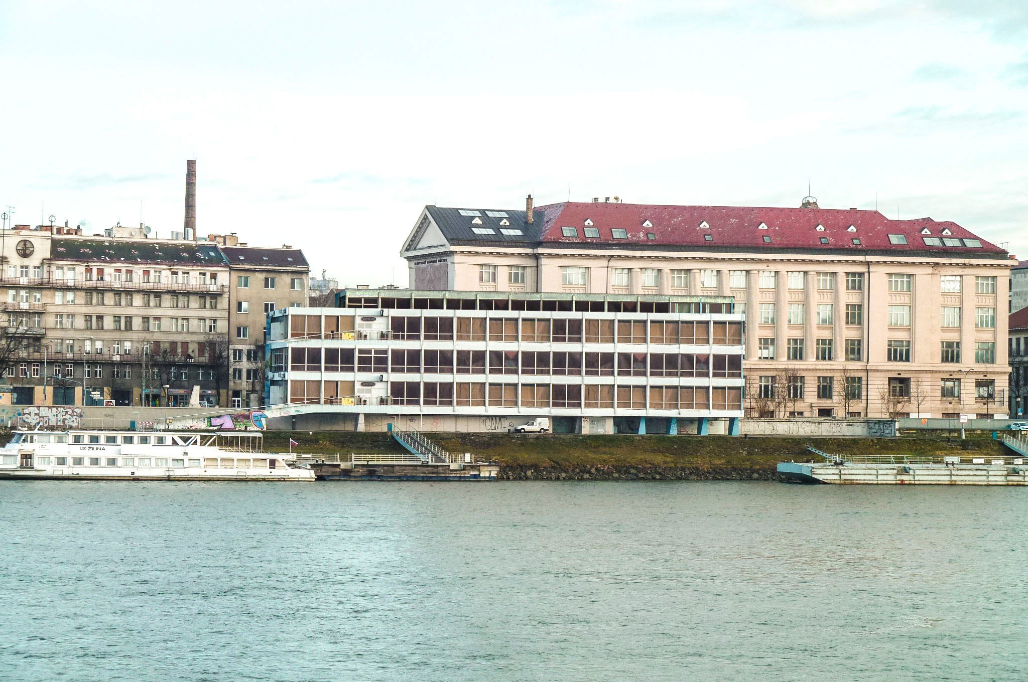 Súčasná panoráma staromestského nábrežia, na ktorej vidno budovu SNM, strojnícku priemyslovku na Fajnorovom návreží a v pozadí aj filozofickú fakultu UK...