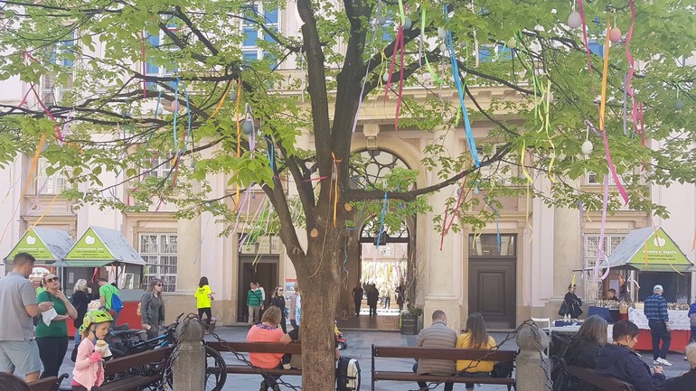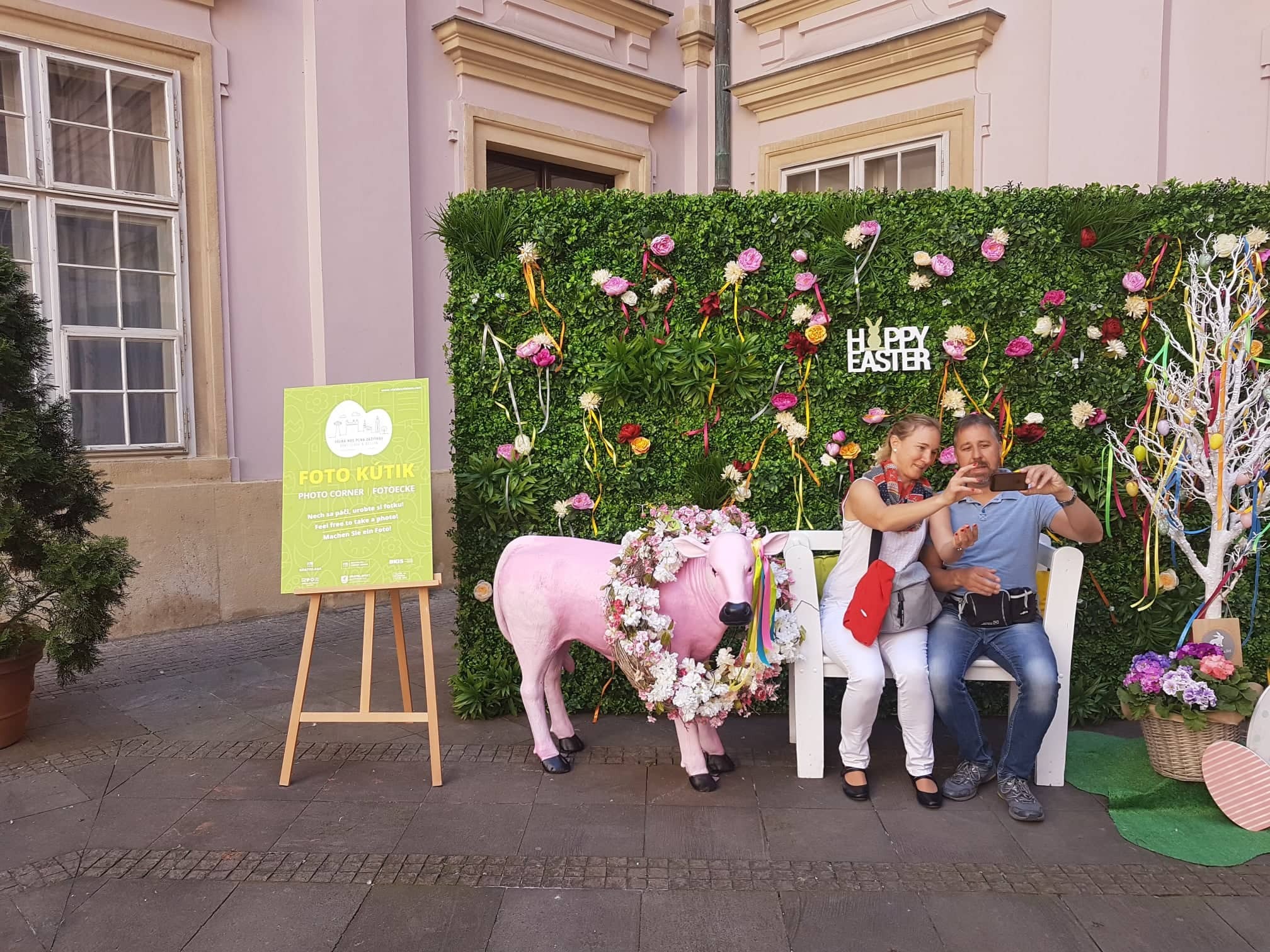 Pri Primaciálnom paláci nechýbal ani Foto kútik s veľkonočnou výzdobou a lavičkou, na ktorej sa mohli zvečniť rodinky či páriky.