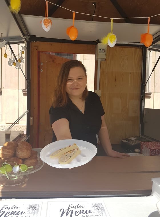 Ak pre vás pôst neplatí, tak hladní ste z Veľkonočných trhov určite neodišli - k dispozícii boli aj stánky s občerstvením, kde ponúkali aj pečené bravčové koleno, škvarkové pagáče alebo syrovú rolku...
