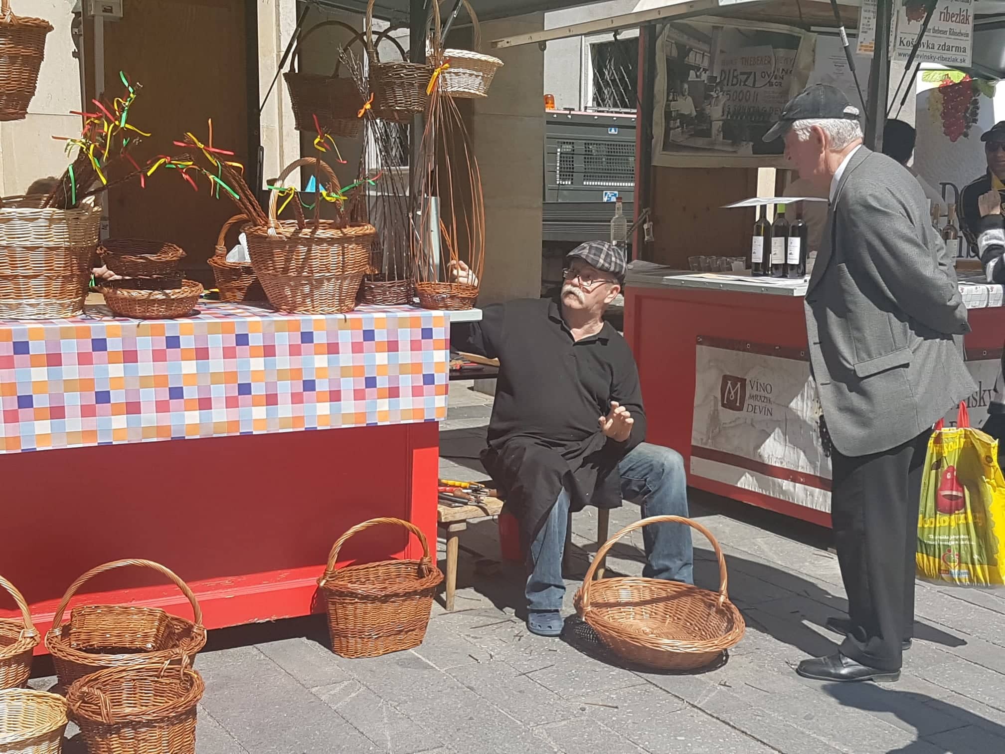 Aj o pletené koše a korbáče býva pred Veľkou nocou značný záujem. Na Primaciálnom námestí ich ponúkal tento pán.