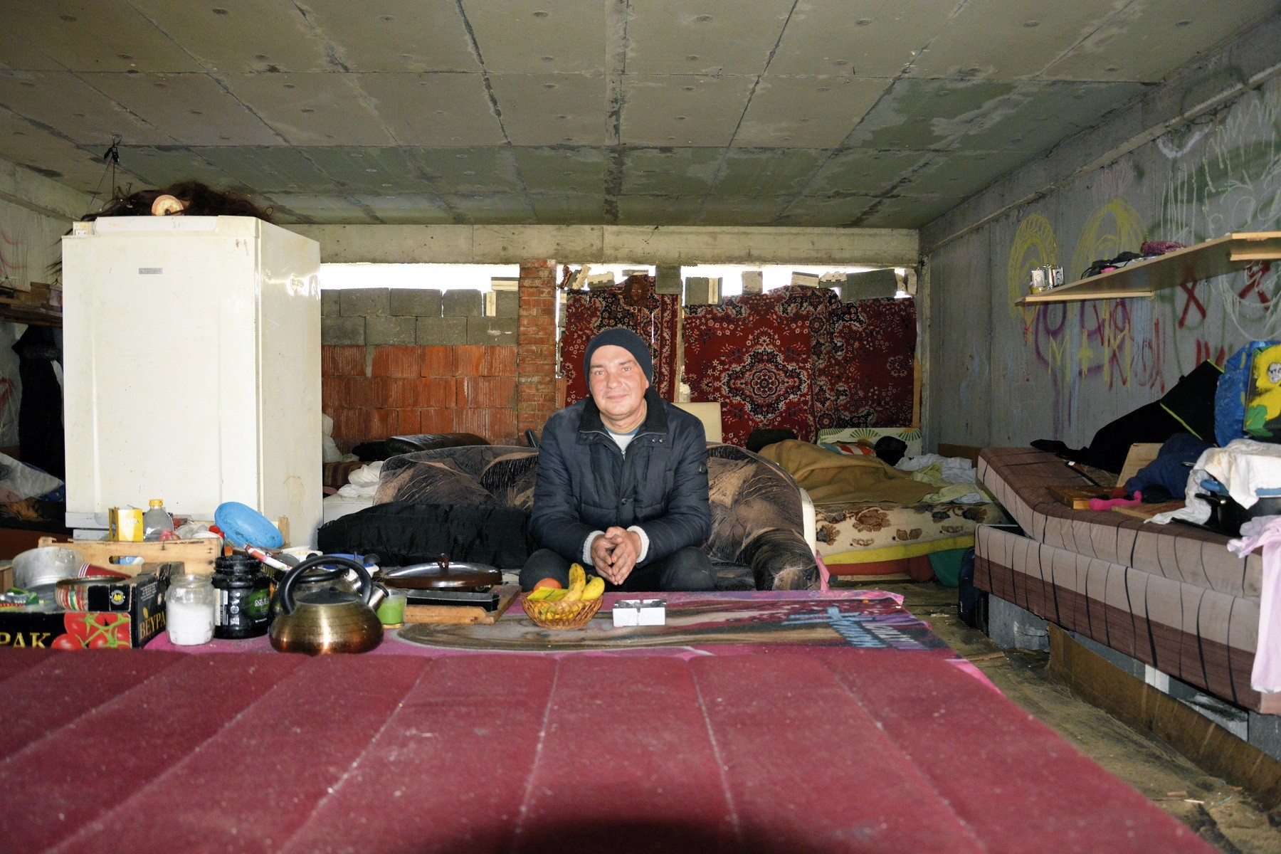 Aj zvonka je vidno, že vnútro skeletu je obývané. Dnu sa dostaneme úplne hravo. Nájdeme tu provizórnu obývačku oddelenú od ruchu Dolnozemskej cesty torzami vianočných stromčekov aj spálňu. Postele, chladnička, hromady vecí, smrad a potkany. Na stole v miske sú banány – pôsobia ako symbol iného, prajnejšieho sveta.
