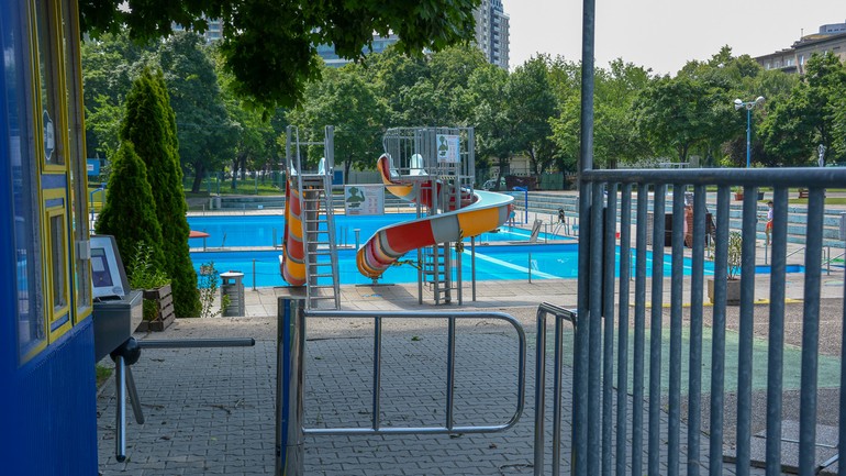 Krasňany: Na rohu Kadnárovej a Černockého ulice sa nachádza aj druhé kúpalisko na území mestskej časti Rača, ale hoci jeho brány boli otvorené, podobne ako blízka krčma s luxusným názvom Džambo club, tak oba bazény ešte zívali prázdnotou.