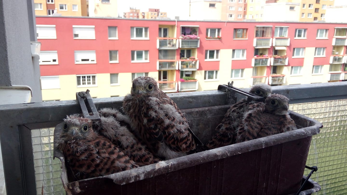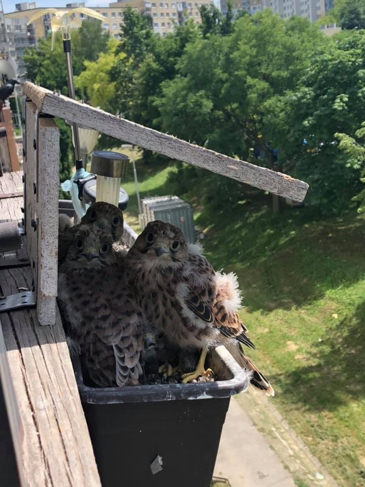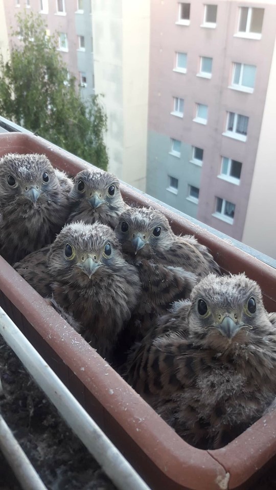 "Aké pekné muškáty! Neviete, kde zoženiem túto odrodu?" vtipkovali diskutujúci pod touto fotografiou mláďat sokola myšiara svorne poukladaných do hranatého kvetináča na balkóne...
