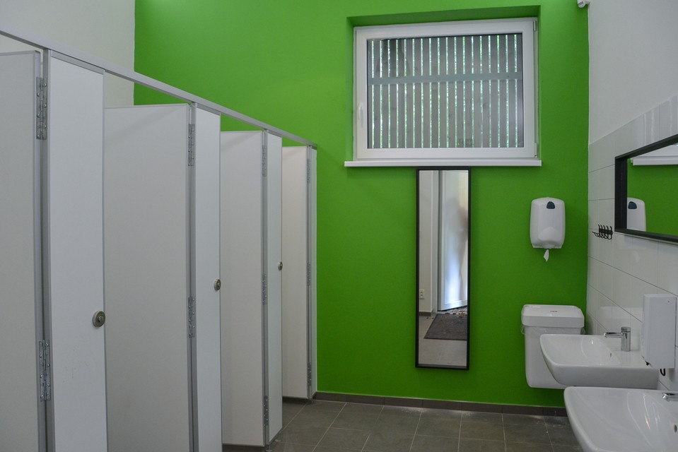 Verejné toalety sú riešené naozaj veľkoryso, majú päť miestností, všetky vybavené podlahovým kúrením. Je tam WC pre dámy, pánov aj ŤZP, prebaľovacia miestnosť pre mamičky s deťmi a dokonca tri sprchy (ktoré sa musia po každom použití vydezinfikovať, aby sa dodržali hygienické štandardy). Na vonkajšej strane je, navyše, umývačka bicyklov. Suma takmer 130-tisíc eur nám napriek tomu pripadá značne premrštená – až na podlahové kúrenie nie je vnútri nič extra, žiadne pozlátené kľučky či batérie. Kabínky sú oddelené bežnými umakartovými stienkami, priečky sú zo sadrokartónu, dlaždice aj obklady bežného typu...