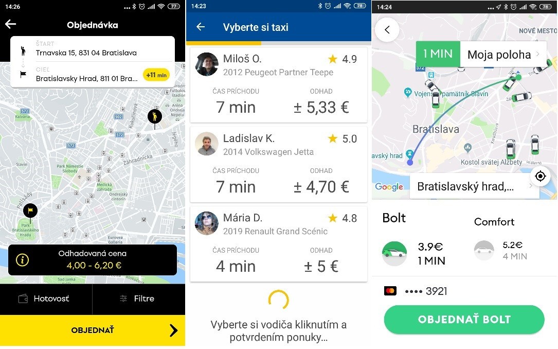 Ak sa veľmi ponáhľate, tak najrýchlejšie vám pristaví auto Bolt, ak sa chcete odviezť čo najlacnejšie, tak si počkajte na Uber.