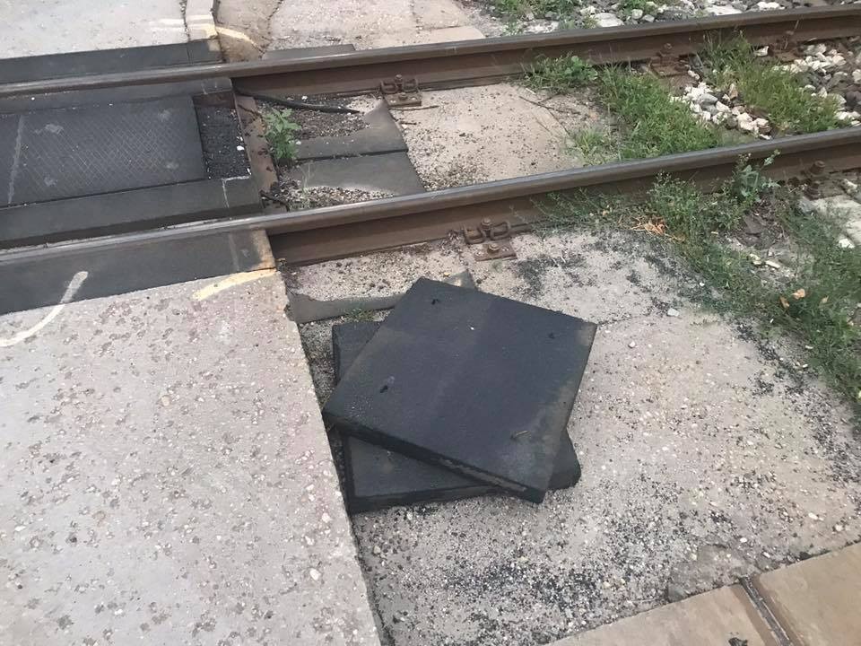 Tu vidno vytrhané kusy gumeného pásu, ktorý mal uľahčiť autám prechod cez koľajnice...