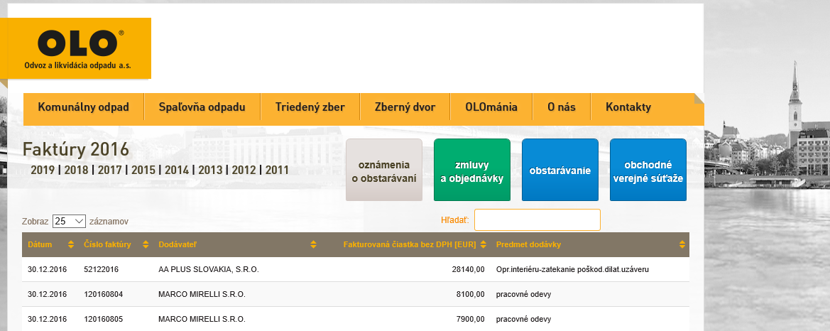 Spoločnosť Odvoz a likvidácia odpadu (OLO) na svojej webovej stránke zverejnila dve faktúry od firmy Marco Mirelli. Jednu v hodnote 8 100 eur a druhú za 7 900 eur. Obe boli v roku 2016 tejto módnej značke vyplatené. „Išlo o jednotné pracovné oblečenie s logom spoločnosti na reprezentačné účely pre 16 zamestnancov spoločnosti OLO,“ vysvetlila nám hovorkyňa OLO Beáta Humeníková. O akých konkrétnych zamestnancov išlo, sme sa už nedozvedeli, hoci sme sa pýtali.