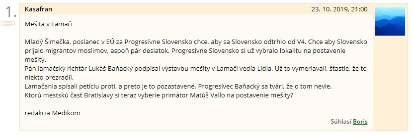 Na internete sa prvá správa o výstavbe mešity na území mestskej časti Bratislava - Lamač objavila 23. októbra 2019 a bolo v nej užívateľom s nickom Kasafran napísané: "Mladý Šimečka, poslanec EÚ za Progresívne Slovensko chce, aby sa Slovensko odtrhlo od V4. Chce, aby Slovensko prijalo migrantov moslimov, aspoň pár desiatok. Progresívne Slovensko si už vybralo lokalitu na postavenie mešity. Pán lamačský richtár Lukáš Baňacký podpísal výstavbu mešity v Lamači vedľa Lidla. Už to vymeriavali. Šťastie, že to niekto prezradil. Lamačania spísali petíciu proti, a preto je to pozastavené. Progresívec Baňacký sa tvári, že o tom nevie. Ktorú mestskú časť si teraz vyberie primátor Matúš Vallo na postavenie mešity?"