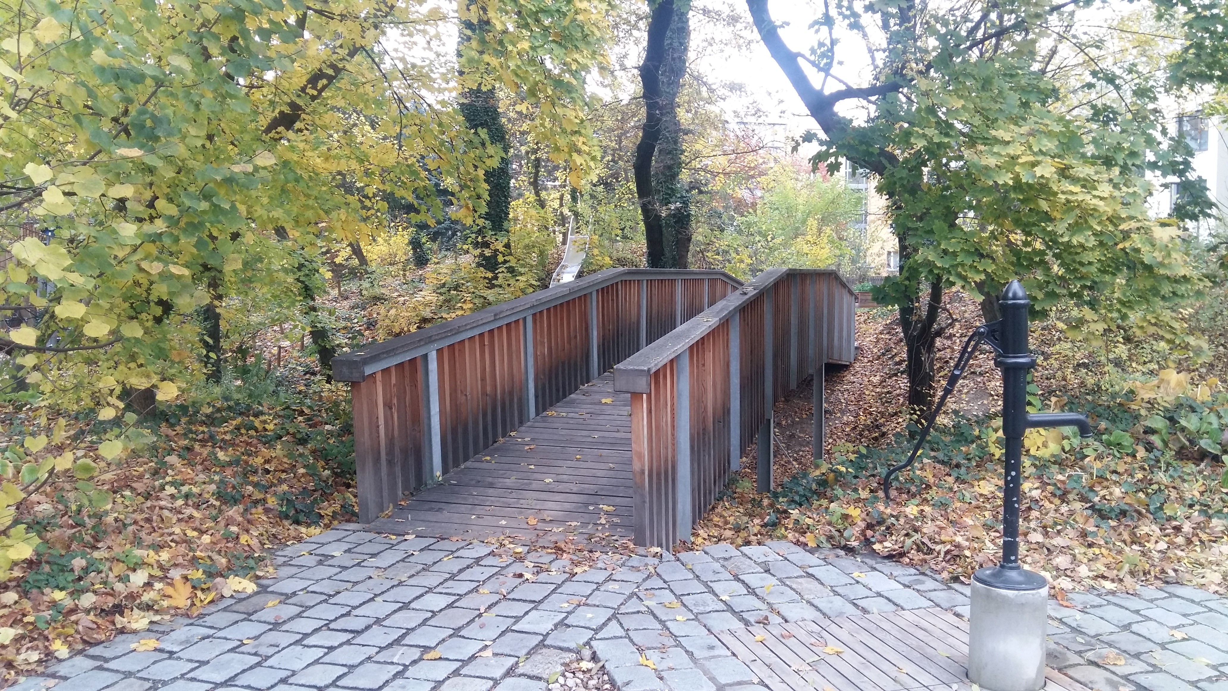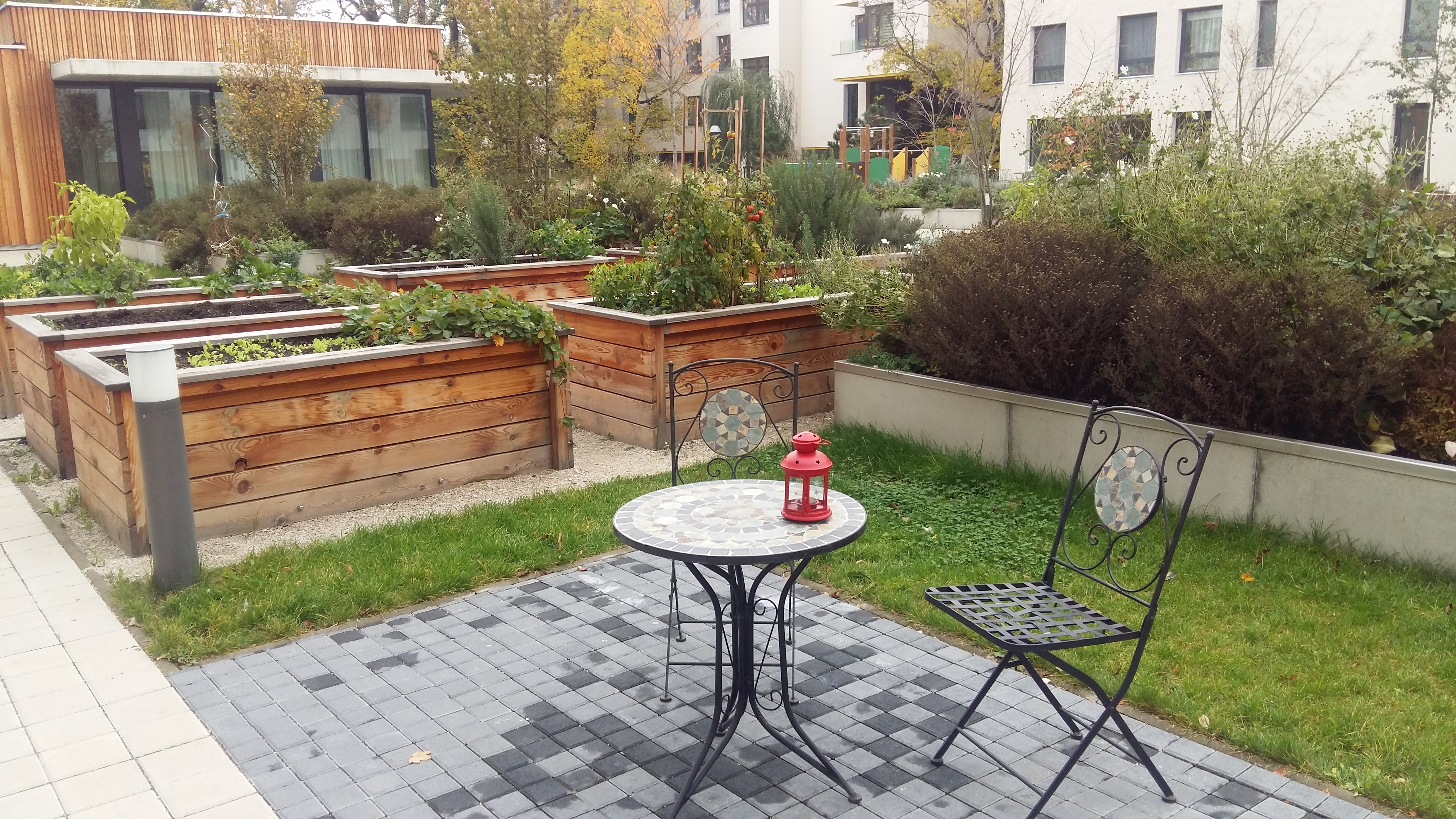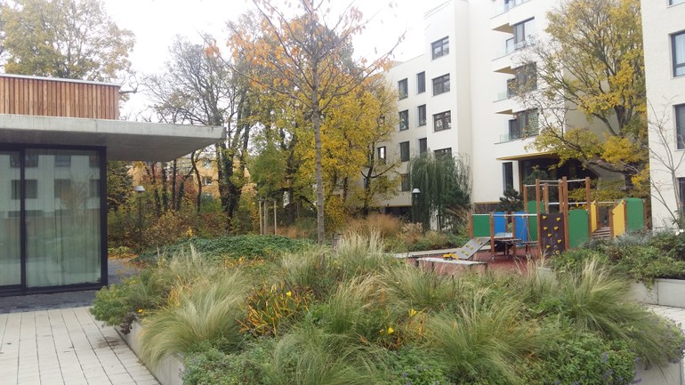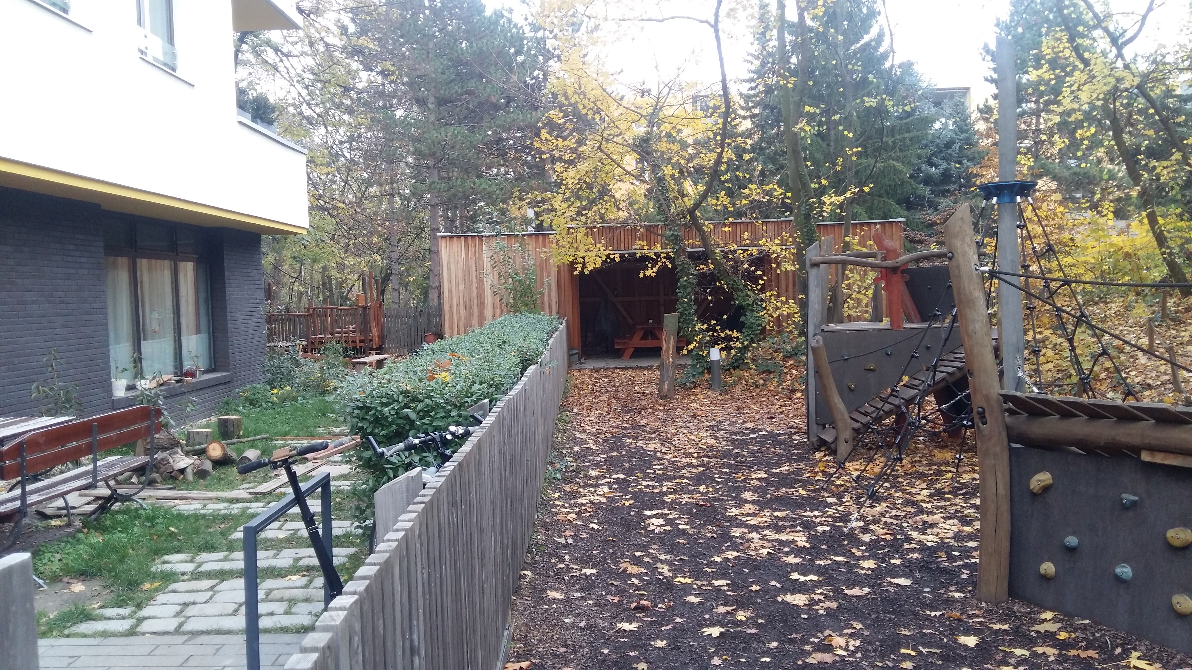 Prechádzame okolo vyvýšených záhonov, kde už susedia pozbierali svoju úrodu, evidujeme kompostéry. Uprostred komplexu stojí klubovňa, hneď za ňou nás prekvapí studňa a vedľa jazierko s lavičkami. Stromy na priľahlom kopci takmer zakrývajú časť domu. Pieskovisko, desaťmetrová šmykľavka pre deti, škôlka pre 25 detí, dve ihriská, miesto na grilovanie, drevený prístrešok... Prechádzame cez mostík ponad niekdajšie, dnes už vyschnuté dunajské rameno a ocitáme sa v lese, pri ohnisku s drevenými lavicami. Toľko miest, ktoré možno zdieľať a kde sa z anonymných susedov môžu stať priatelia...