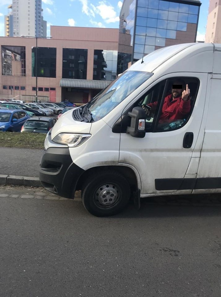 Keď si vodič všimol, že si ho okoloidúci fotí, tak mu s úsmevom na tvári do objektívu ukázal vztýčený prostredník. Hoci toto gesto príliš slušné nie je, tak v bratislavskej doprave sa vyskytuje najmä pri konfliktoch vodičov pomerne často. Málokedy sa ho však podarí takto detailne zdokumentovať...
