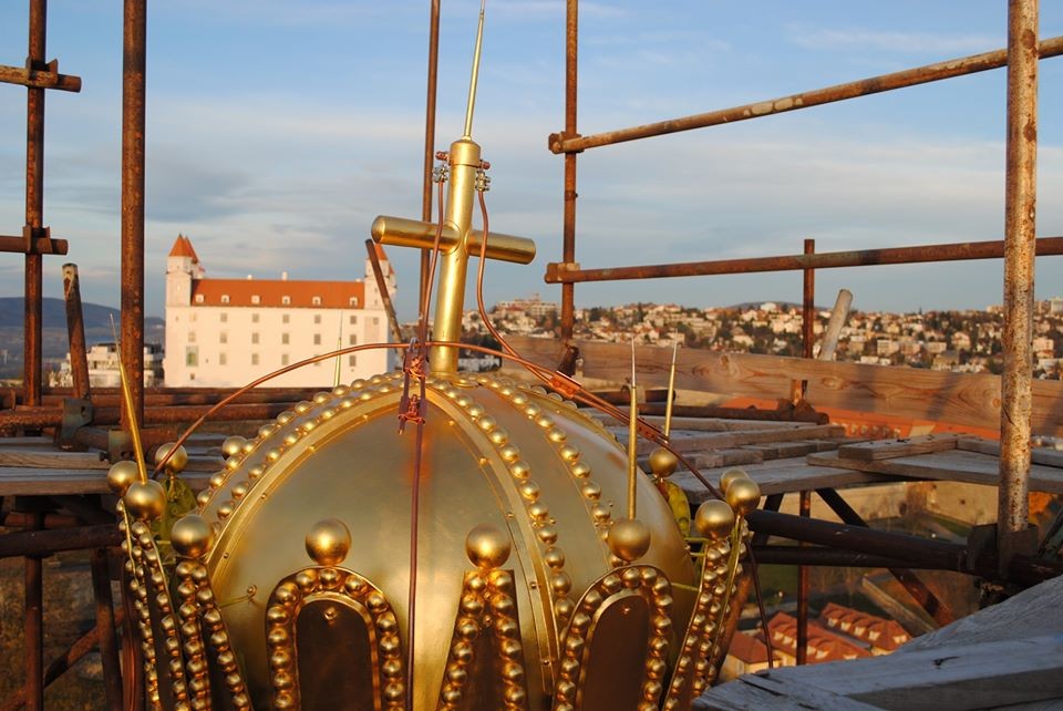 Dušan k fotke uviedol: "Na hlupákov hľadieť z vrchu. Toľko k úbohým kopancom do Bratislavy. 5.11.2010 sa rozoberalo toto lešenie, začínalo sa asi o šiestej ráno a len tak tak som tam stihol vyšplhať. Koruna bola po renovácii osadená deň predtým a lešenie muselo ísť dolu, lebo ten objekt mimoriadne lákal verejnosť. V ten deň som mal 50 rokov."