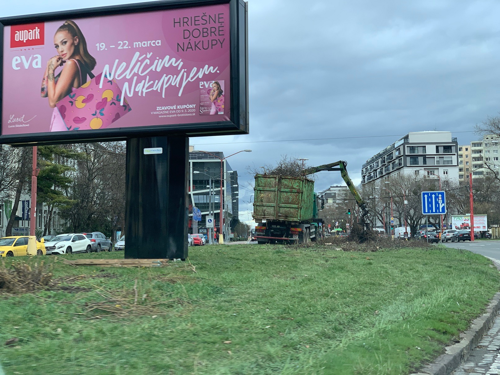Z trávnatého ostrovčeka uprostred Trnavskej ulice skoro všetky veľké stromy 10. marca 2020 zmizli a o deň neskôr poodvážali aj popílené pne a konáre, teda všetko drevo, ktoré z nich zostalo: