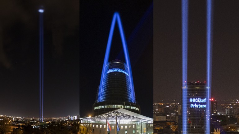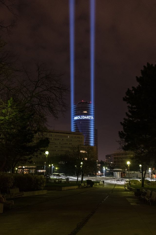 Z tejto fotografie je už úplne zrejmé, že lúče vychádzajú z budovy Národnej banky Slovenska. Tá verejnosť informovala, že svetelný maják doplnil už existujúce nasvietenie budovy, na ktorej zase NBS komunikuje odkazy, ktoré sú podľa nej potrebné - solidaritu, aby ľudia ostali doma, nehanbili sa za rúško, spoločne s dôležitým odkazom: #SpoluTozvládneme. Ten sa nachádza aj na Úrade vlády či v Prezidentskom paláci...